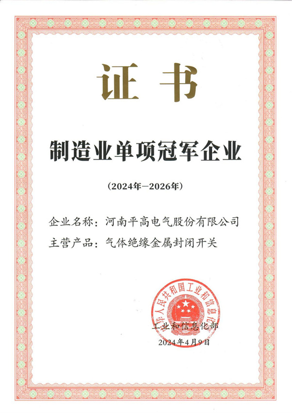 制造業(yè)單項冠軍證書