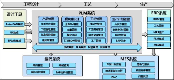 通過NX三維零件設(shè)計(jì)、EPLAN電工電路設(shè)計(jì)應(yīng)用,使技術(shù)人員能夠迅速建模,為智能制造提供智慧方案。通過開展PLM、ERP與MES的系統(tǒng)集成,實(shí)現(xiàn)以BOM為核心的數(shù)據(jù)貫通和以業(yè)務(wù)為核心的流程貫通。管理人員只需打開MES,輕點(diǎn)鼠標(biāo),各工序的生產(chǎn)情況、產(chǎn)出及庫存情況、成品庫存等就能呈現(xiàn)眼前。系統(tǒng)的集成應(yīng)用,使零件庫存降低49.24%,核心產(chǎn)品生產(chǎn)周期由21.3天縮短為18.1天,生產(chǎn)效率提升30%,產(chǎn)品不良率降低20%,電子化質(zhì)檢卡使減少用紙12萬張。