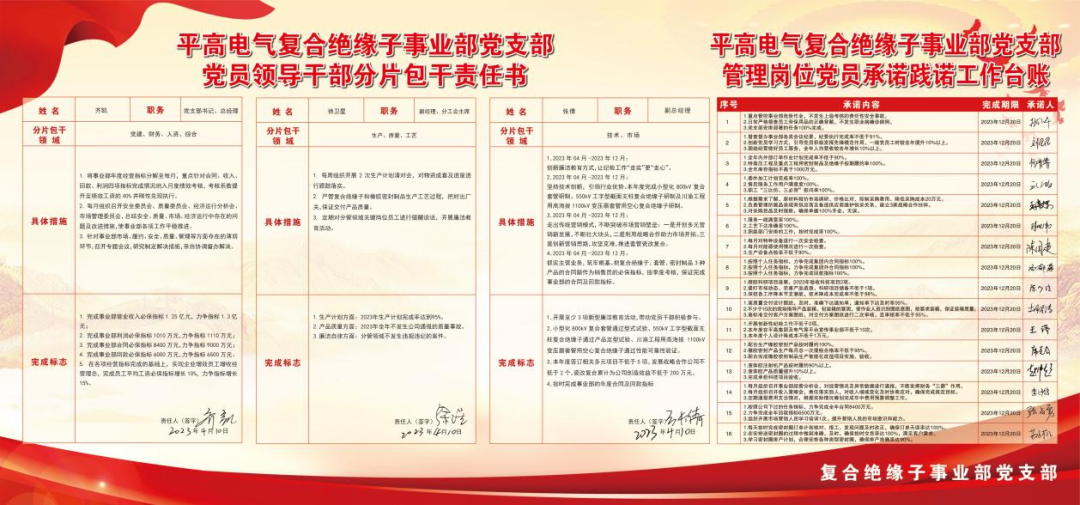“承諾”不僅要上墻,更要上心。平高電氣復(fù)合絕緣子事業(yè)部同步開展黨員領(lǐng)導(dǎo)干部分片包干活動。領(lǐng)導(dǎo)干部簽訂《黨員領(lǐng)導(dǎo)干部分片包干責(zé)任書》。班子成員聚焦分管領(lǐng)域的年度重點工作,明確路線圖、制定時間表,掛圖作戰(zhàn),銷號管理,推進重點工作落地落實。保證承諾有結(jié)果,踐諾有實效。