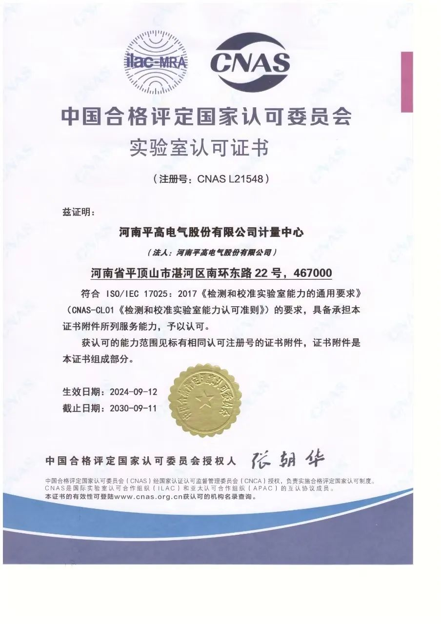 再獲國家認(rèn)可!平高電氣一個實驗室通過CNAS資質(zhì)認(rèn)證!